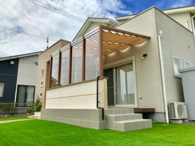 ガーデンテラスを取り付け下面はこだわりのデザイン壁で目隠しを、タイルをデッキの高さと同じにして広々と使えるようになりました。