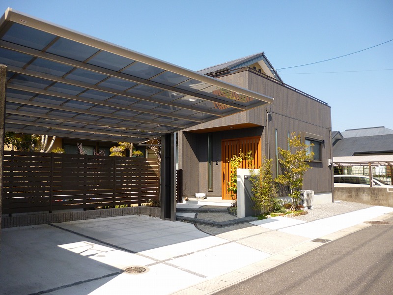2トーンのカーポートが映えるモダンな新築外構 延岡市O様邸