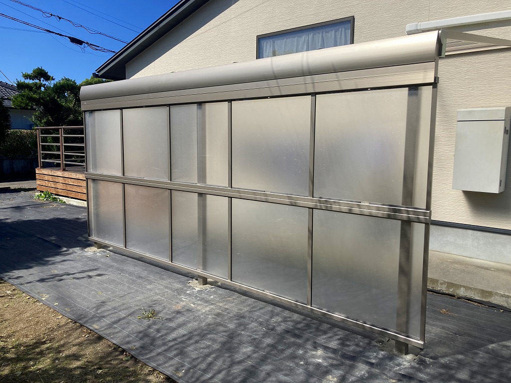 三協アルミさんの屋根テラスレボリューという商品に、前面パネル2段と、隙間カバーを設置しました。
