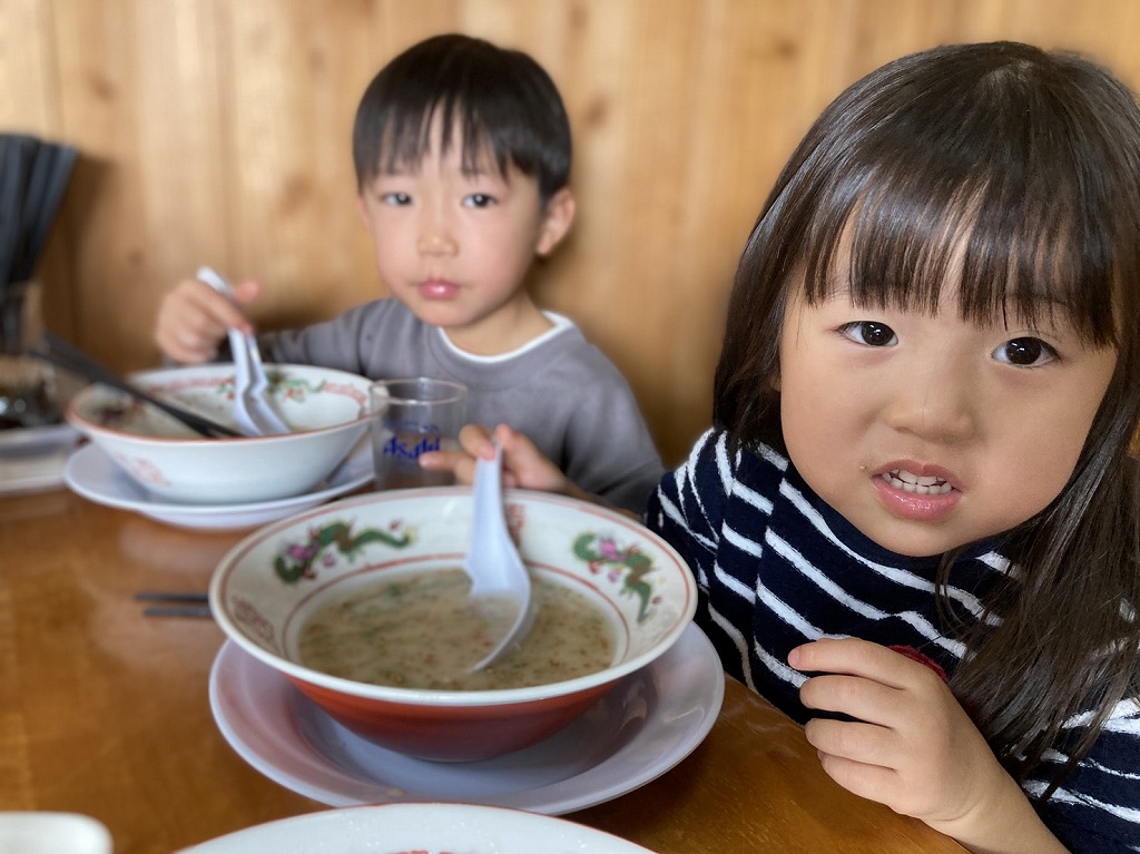 お兄ちゃんは宿題があるので妻とお留守番でちび二人を連れて加治木にあります博多ラーメンの名店「ラーメン鎮」へ