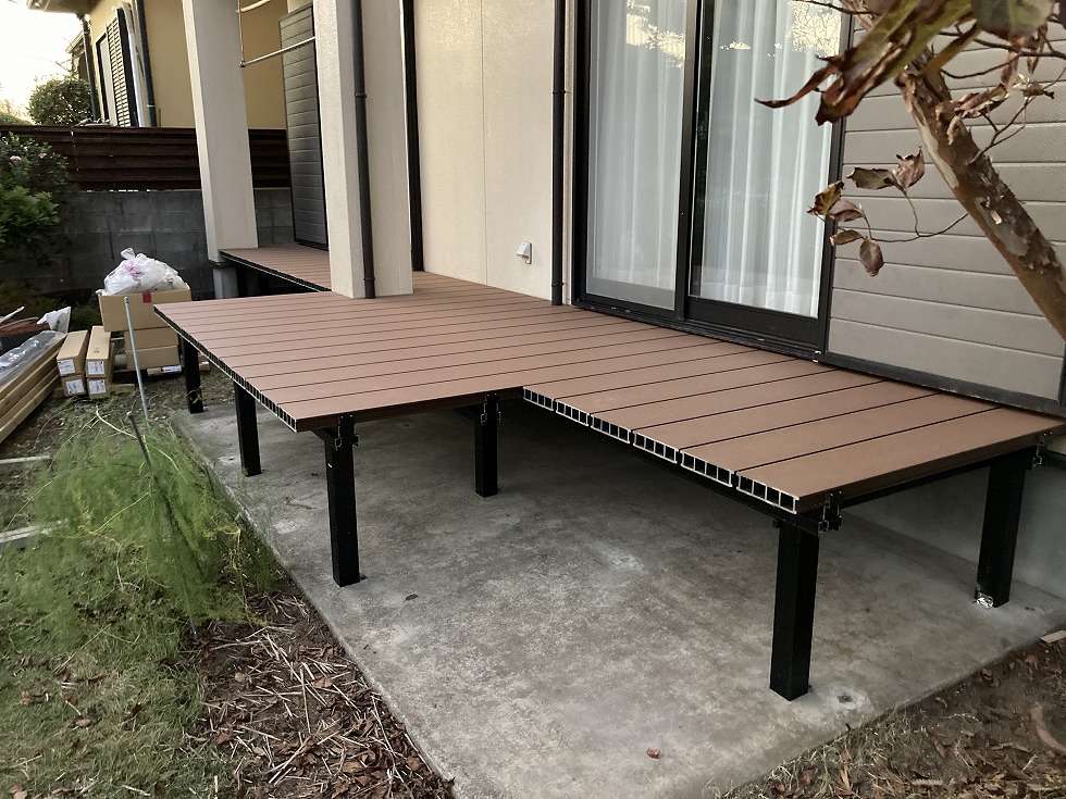 デッキの骨組みを組んでから、樹脂製の人工木を並べていきます!