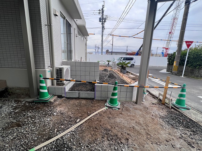 一方お庭の方は一部の既存ブロックを流用し新たにブロックを積んでいきます。