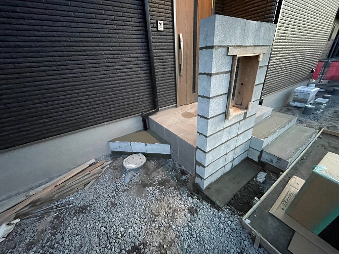 建築前にご相談いただいたので無駄に階段をハウスメーカーさんでは作らずに外構に合わせて弊社で作成しました。早めにご相談いただくと後から壊したりと無駄なく外構が進めることができます。