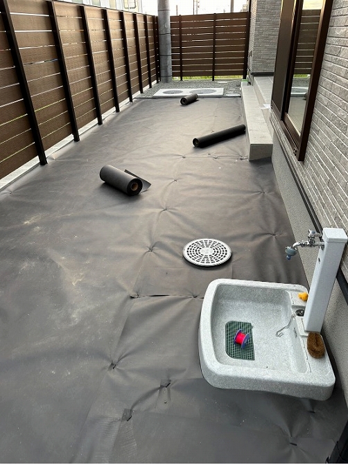 お庭には防草シートを敷いていきます。お客様がご自身で人工芝を施工予定です。