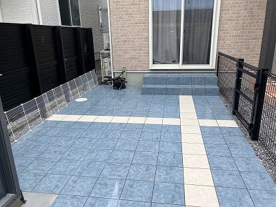 窓前にはブルーとホワイトのさわやかなタイルデッキを施工いたしました!周りを囲っているのでわんちゃんが飛び出す心配もありません!