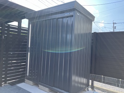 物置も設置しています、こちらは本体のお色味が新色のフランネルグレーになっています。