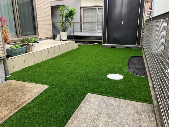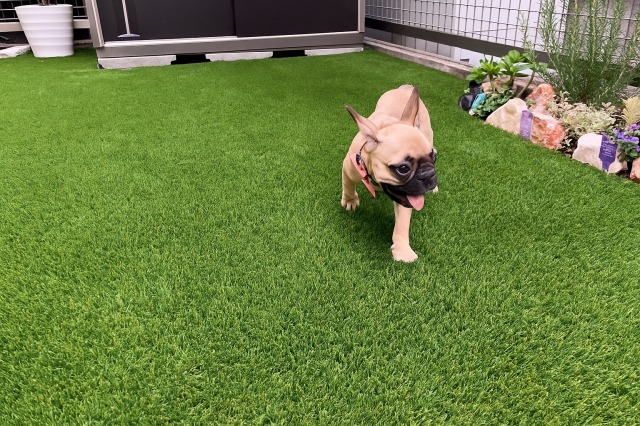 お庭全体に人工芝「エバーグリーン」を施工し、ワンちゃんが安心して走りまわれるお庭に変身しました!