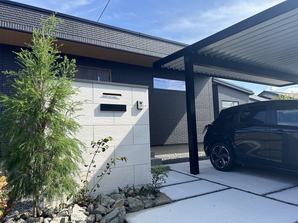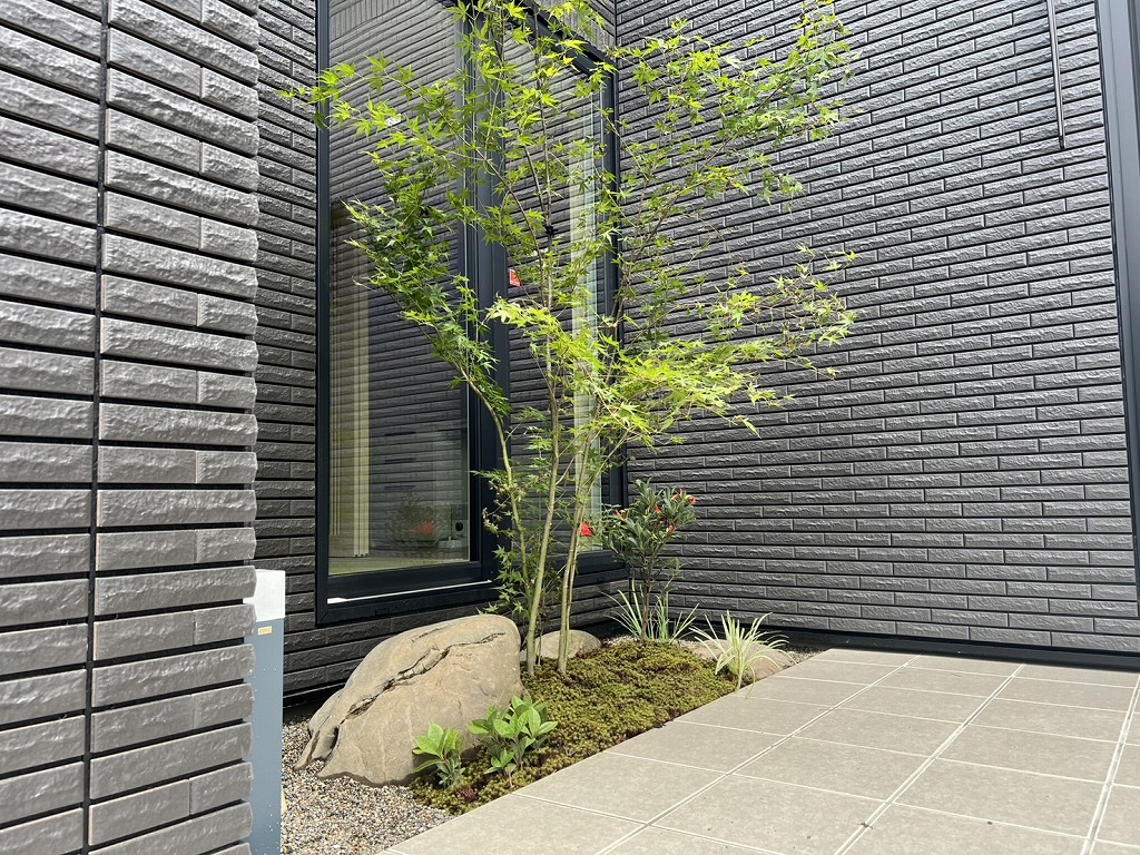 シックで重厚感のある建物を引き立てながら、植栽や明るい素材でやわらぎをプラスした今回の外構。お客様にも大変喜んでいただける仕上がりとなりました。