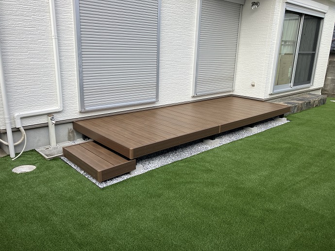 人工木デッキもいくつか種類があり、ご自宅をお伺いして湿気が多い地域と判断しましたので表面が固めで水をよくはじくプレミアムタイプをご提案しました!苔など根付いてしまうものに強いですのでおススメで水をよくはじくため雨のあとデッキの上に水滴ができますがゴムモップなどをご準備すればキレイに押し出すことができます!