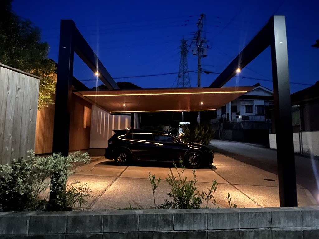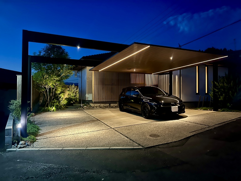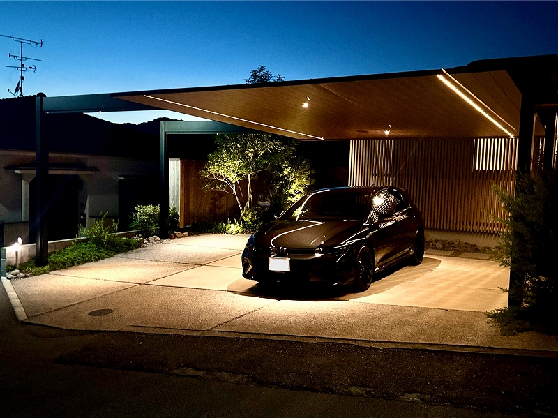 カーポート全体を包み込むように照らし、建物外観の水平ラインを際立たせるライティングデザインになっています。