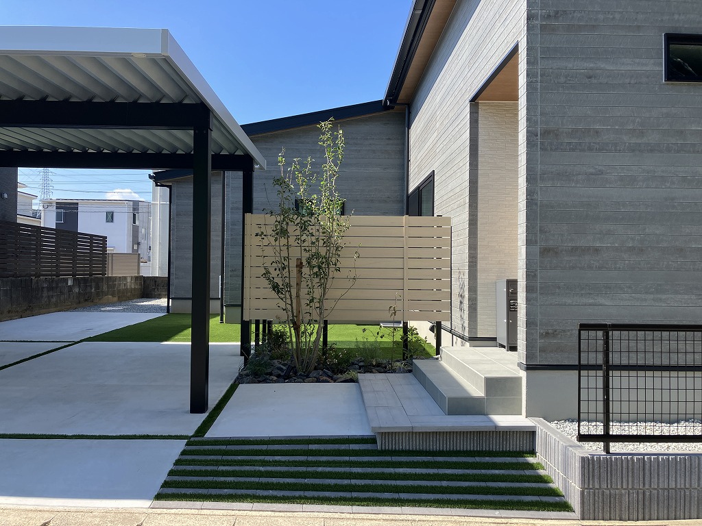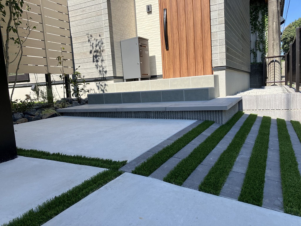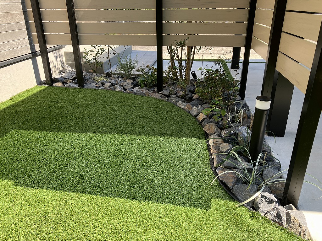 お庭には人工芝と自然石を組み合わせた植栽スペース。お手入れがしやすく、季節を問わず美しい緑も楽しめます。細部までこだわった上品なエントランスです。T様 お世話になりありがとうございました。