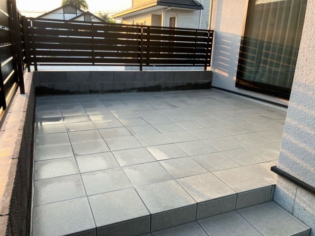 掃き出し窓の前には、広々としたタイルテラスを施工いたしました。