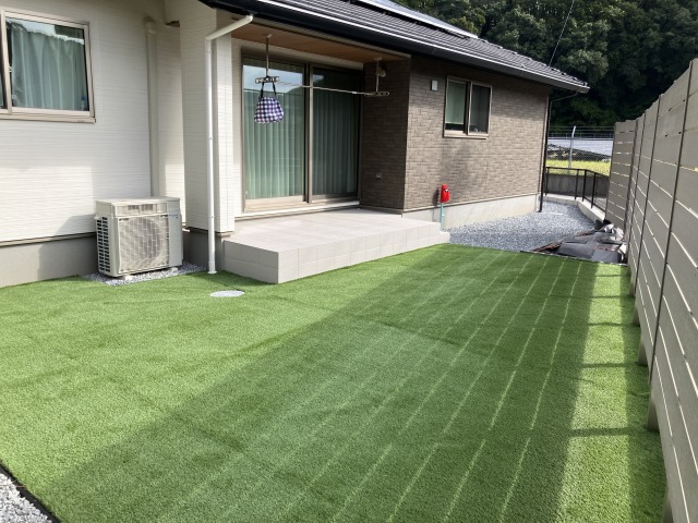人工芝のお庭は明るいグリーンが気持ちよく、リビングからの眺めも一気に華やかに!