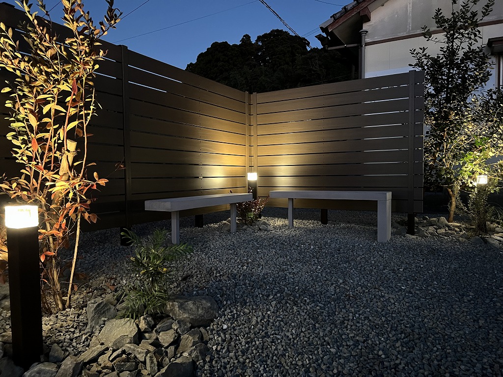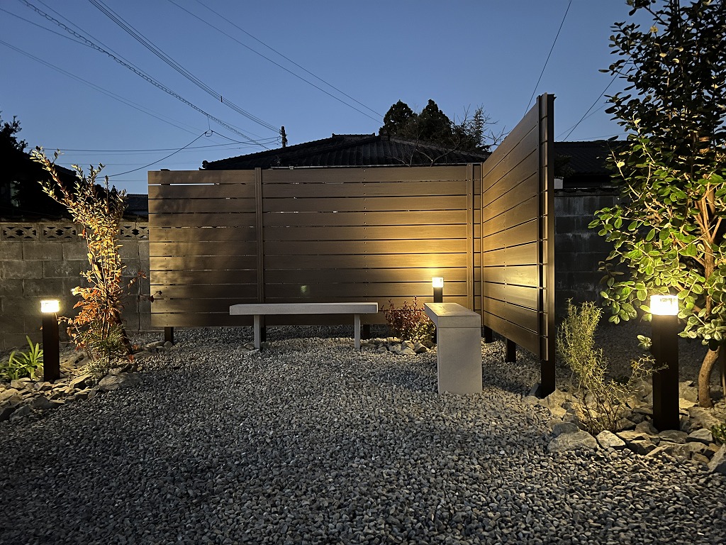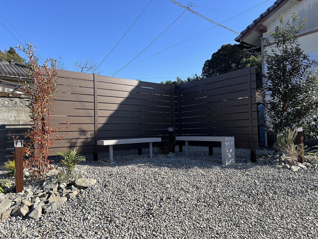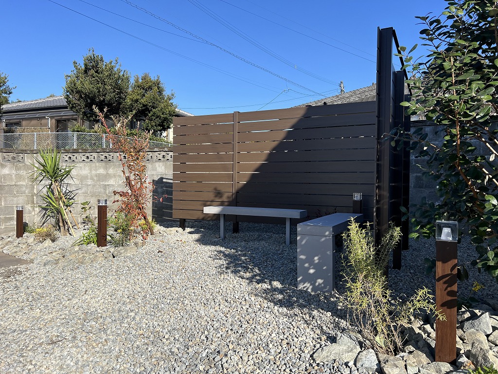 目隠しフェンスと植栽で程よく囲われた空間をつくりベンチでゆったり過ごせるスペースに。管理も格段に楽になりました。