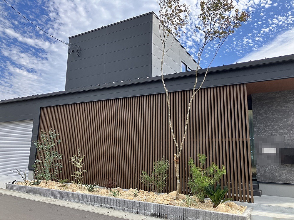 とのご要望にほとんどお任せで植栽を入れさせていただきました。植栽の周りには栗石も敷きこみました。