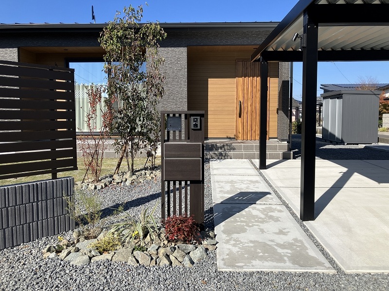建物の色に合わせて全体の色をダークトーンでまとめていただき、大人のナチュラルモダンな外構が完成しました!