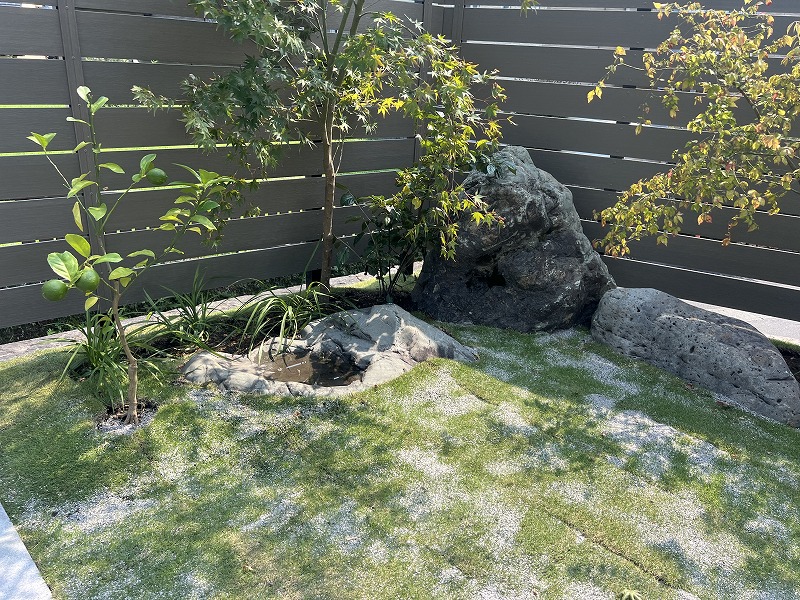 こちらの庭石は施工前にお庭にあったお庭を活かして職人さんが手水鉢のようなイメージで配置してくださりました。落ち葉がこの水面にひらひら落ちるのも風情がありいいですね。