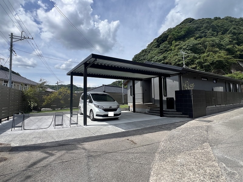 【1】カーポート×土間コンクリートで“グレーの家”と一体化したファサード