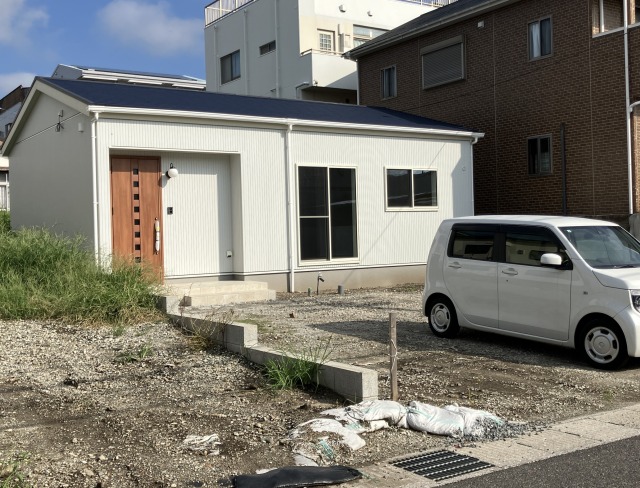 縦ラインの入った白い外壁が特徴的な平屋です。