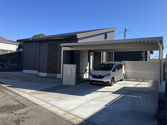 完成がこちらです。ハウスメーカーさんとも早い段階から連携も高さ関係の把握が早くでき駐車場から玄関まで傘を差さず向かうことできるようにしました!カーポートの梁を延長し車の出入りの際スペースをとらないようにしました。メイン駐車からゲスト駐車、ちょい止めできるように車が入る所はすべてコンクリート打設を実施しました。