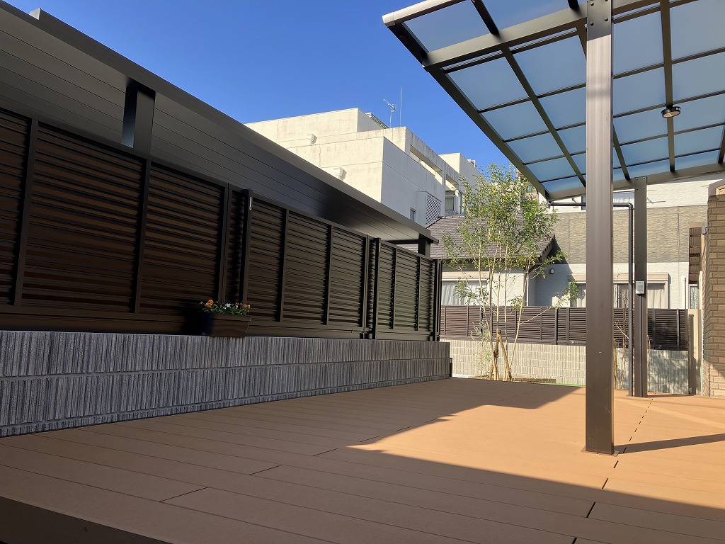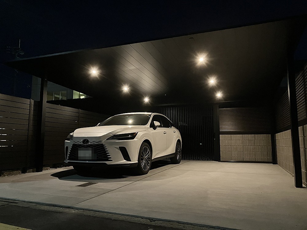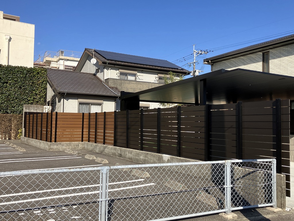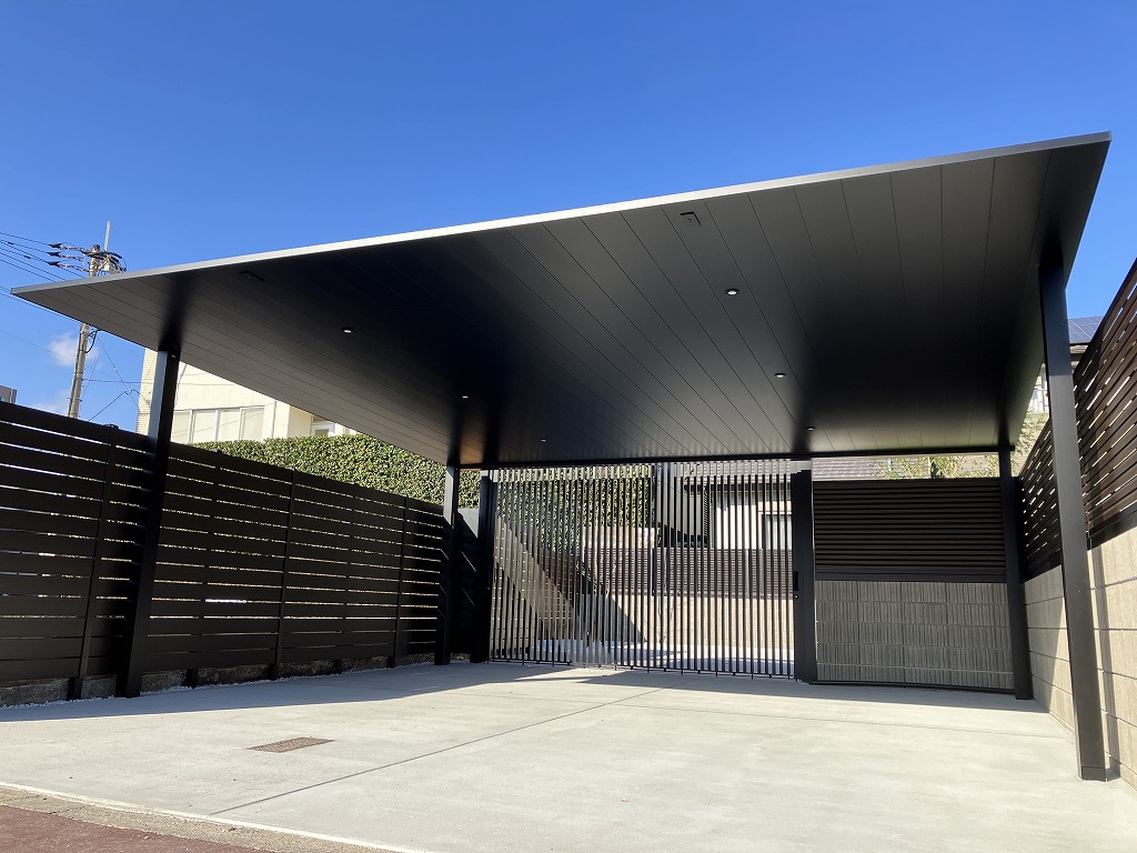 既存の建物(ベージュの外壁)と美しく調和するよう、カーポートとフェンスはダークトーンで統一。水平ラインを強調したフラットな屋根が、邸宅全体の品格をさらに高めています。複数台の愛車をゆったりと停められる、経営者様ならではのスケール感です。