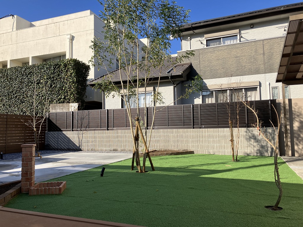 隣地からの目線が気になるので目隠しフェンスを設置。プライバシーを守りつつ、圧迫感を与えすぎない絶妙なバランスを追求しました。庭側と車庫側のフェンスの色のトーンを変えたのも正解でした!