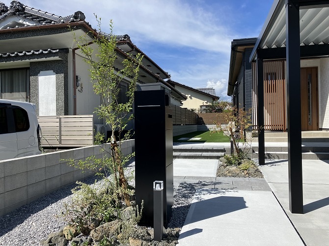 門柱まわりには植栽を配置し、無機質になりがちな新築外構にやわらかさと奥行き感をプラスしています。