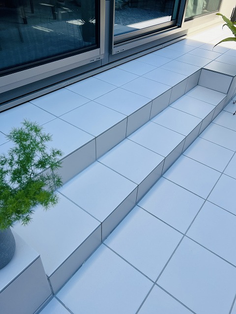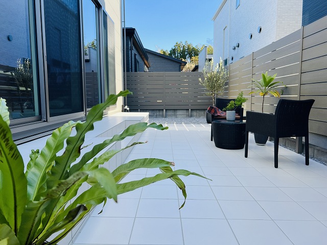 お庭側には、ゆとりのある広さのタイルテラスを施工しました。