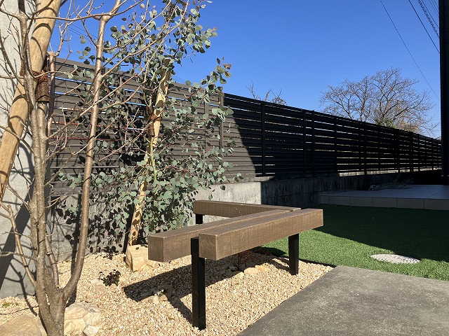 今回の外構で印象的なのが、植栽のそばに設けたベンチです。