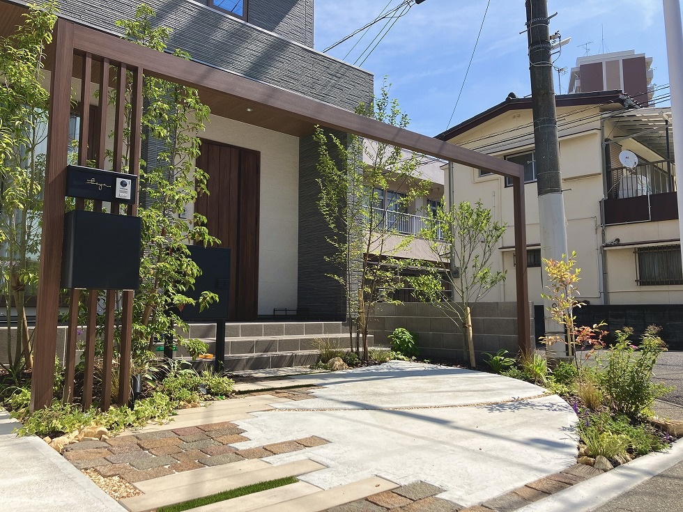 ゲートと鮮やかな植栽で人を迎えるファサードのあるるナチュラル新築外構 鹿児島市M様邸
