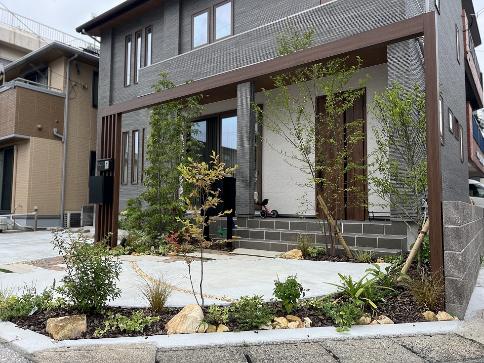 豊かな緑量の植栽に囲まれたモダンな住宅の外構工事 鹿児島市S様邸