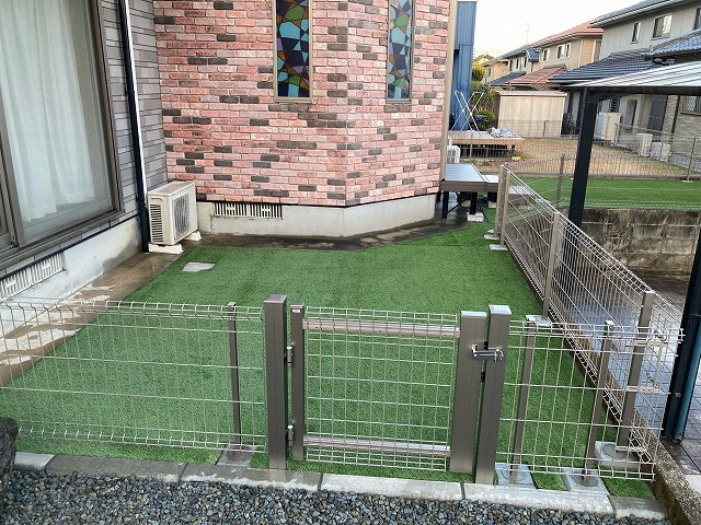 出入りの為小さめの門扉を取付お庭全体をメッシュフェンスで囲いワンちゃんの脱走を抑制してます!