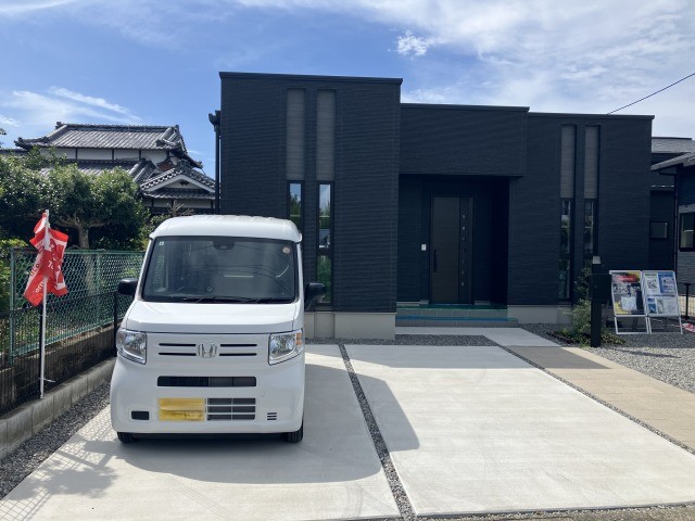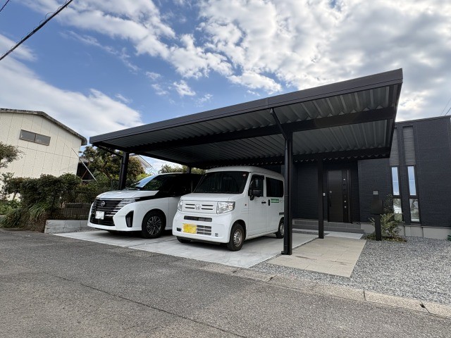 屋根はしっかりかけつつも、ゲスト用の駐車スペースも邪魔をしない柱位置となっています。