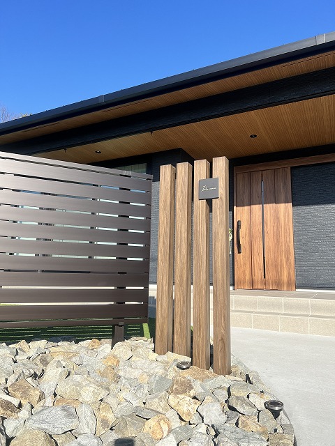 ブラックと木目で統一された水平ラインのきれいな平屋のご新築の外構でした。