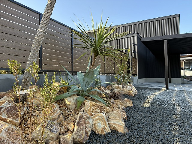 基本となる色は黒で実施これは施主様のこだわりポイントの一つでした。黒色が重くなりすぎないように植栽・ミルストーンを組み合わせ[落ち着き・かっこよさ・暖かみ]を表現いたしました。