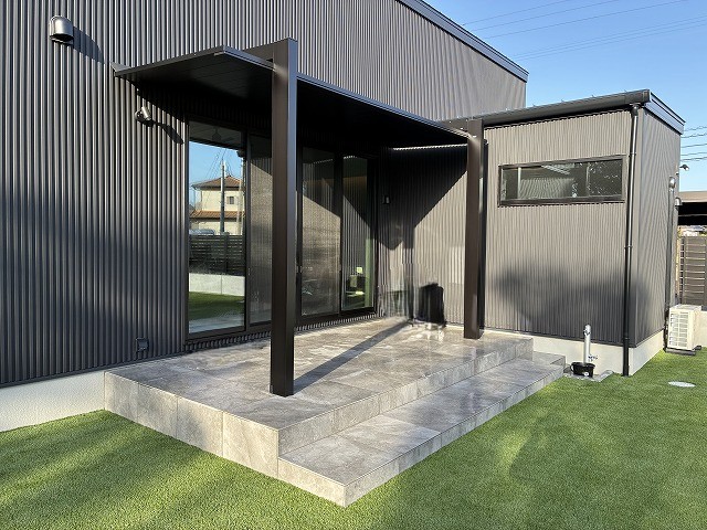 お庭側にはYKKさんのプレーンルーフテラス!外壁のガルバリウムと合わさりかっこいいです!床にはリクシルさんの600角タイルでタイルテラスを作成しまだらなグレーが高級感を感じさせてくれます!