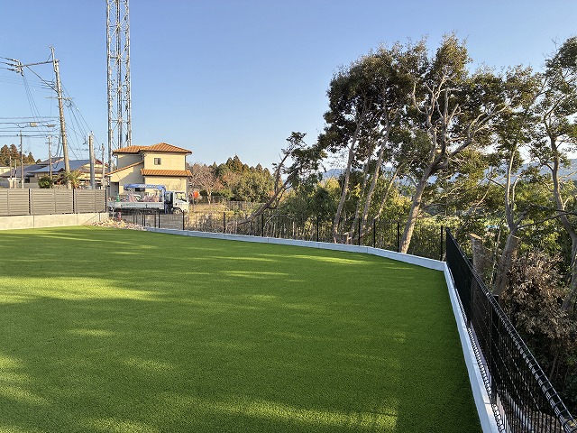 お庭には広大な人工芝を設置しました!ちなみに隣接する山は当社と関わりがあることもあり着工前はわんさかと木々が伸び放題でしたが今回こういった形で接するにあたり伐採いたしました!