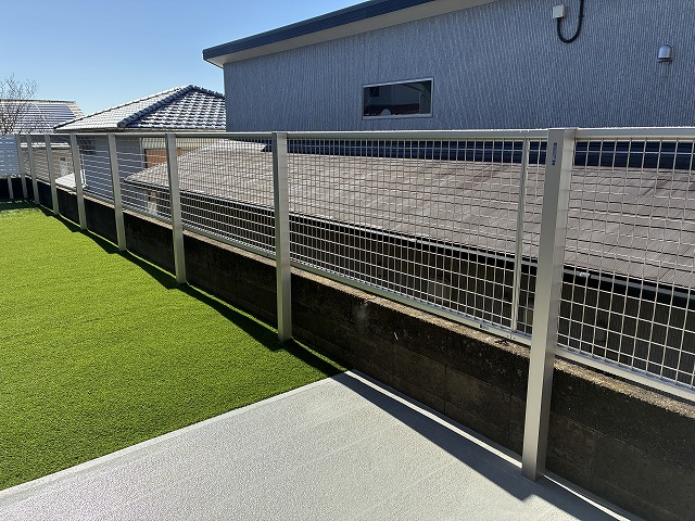 他社さんでは既存のCB上に同型のメッシュフェンスを採用されておりましたが当社のみ独立タイプのメッシュをご提案しました。[既存のブロック老朽化][高低差のある隣地][子どもの出入りがある]以上のことを踏まえてご提案しました。独立タイプを採用するとCB上フェンスと違いコストが上がる、ブロック後方に柱が立つためお庭が狭くなるデメリットもお伝えした結果[安全性と耐久性を優先した施工方法]のご提案を採用いただきました。
