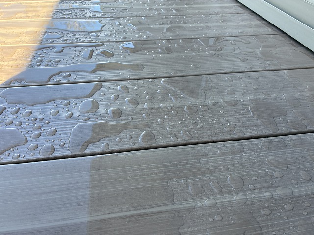 表面仕上げがハードですとこのように水をはじきます!人工木デッキの表面は繊維感のある仕上げが多いです。雨が降るとその表面繊維が水を含み場所によってはシミ汚れとなります。