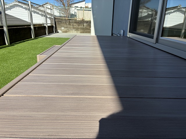 人工木デッキの表面仕上げの違いです。他社さんでは一般的な人工木デッキでしたが当社では表面がハード仕上げになっているヴィラウッドプレミアムをご提案しました。
