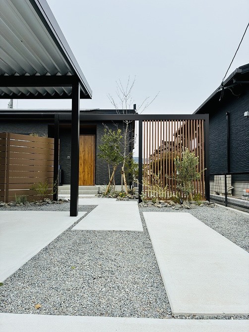 建物の色味と揃えることで、外構全体に統一感を持たせています。