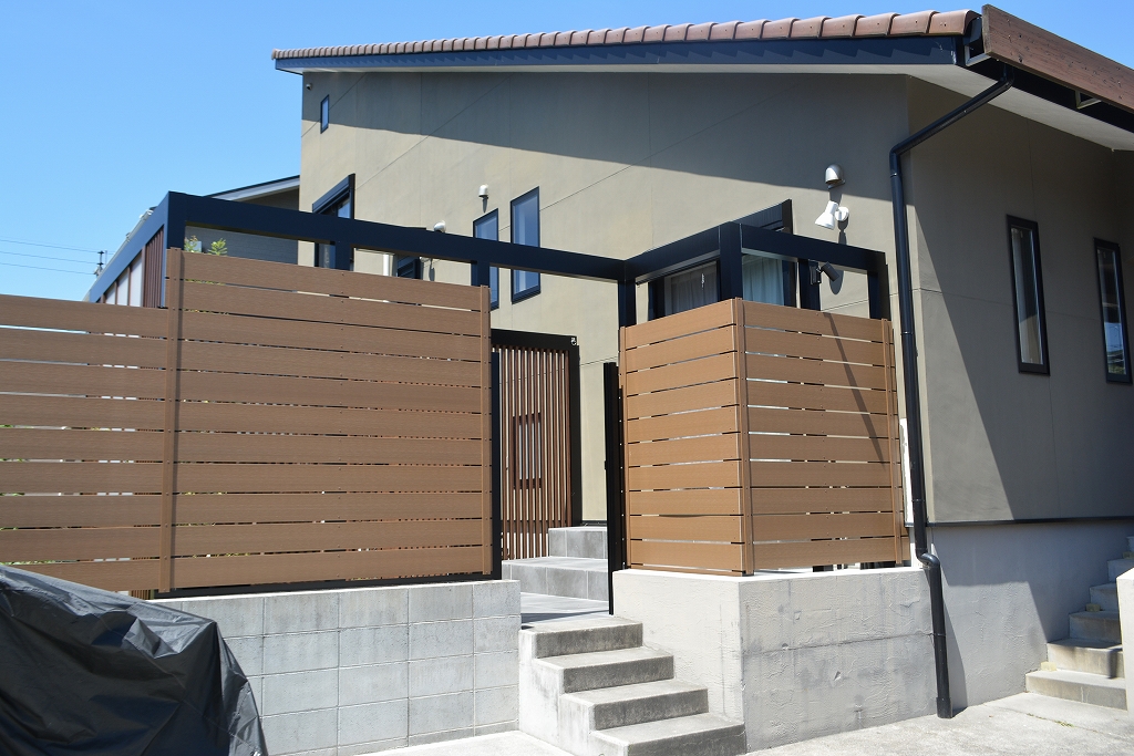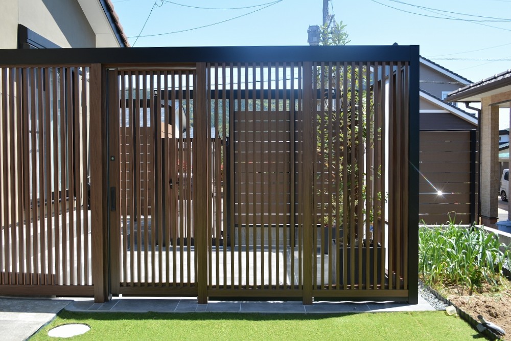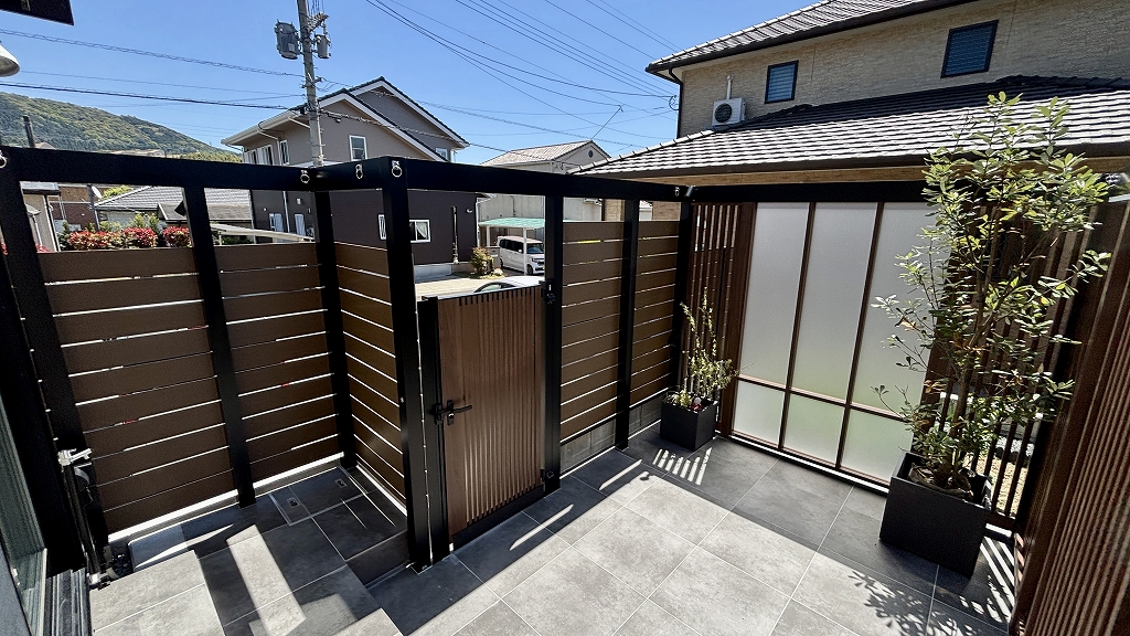 縦格子のウッド調フェンスで三方を囲い、