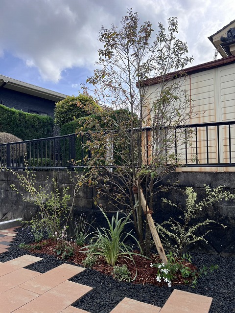 ただ舗装するだけでは何となく寂しい印象になるため、よく目が行くリビング前と玄関前には植栽をご提案させていただきました。