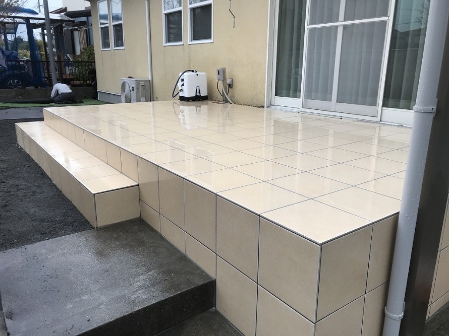 タイルは住宅の色味に合わせて明るい色合いの300角タイルを