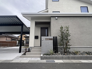 アプローチはモノトーンカラーでまとめ植栽を配置し、シンプルだけど味のある雰囲気に仕上がっております。