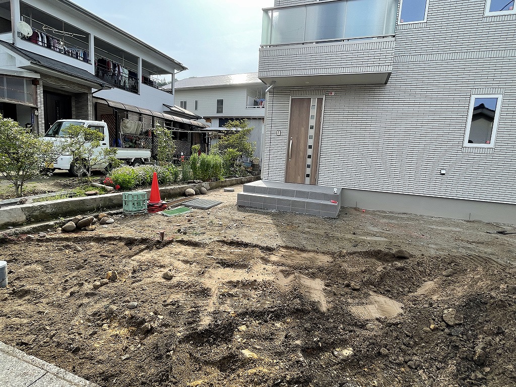 HOME» スタッフBlog »一条工務店のホワイトのハイドロテクトタイルに合う新築外構工事着工 姶良市K様邸