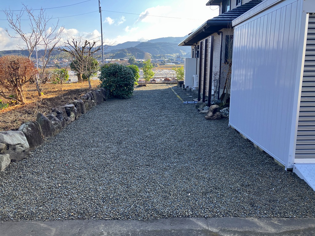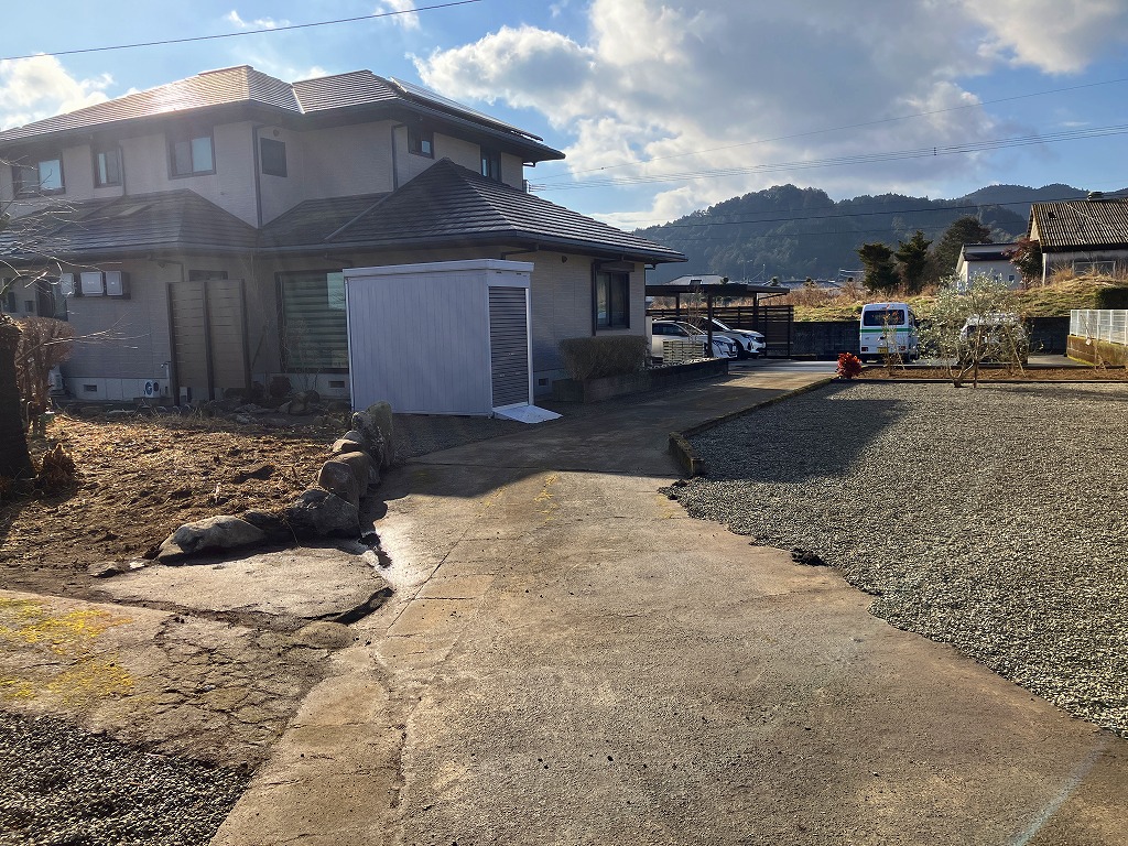 草や不要な植栽を撤去したことで、視界が開け明るい印象になりました。建物への動線・駐車スペースとのつながりも確保でき管理のしやすい庭へ再生です。
